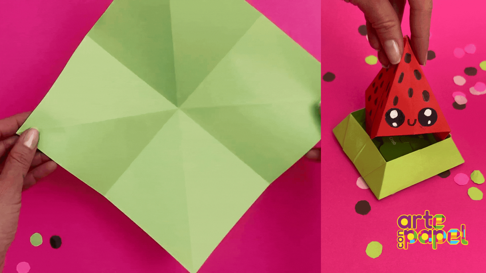 Corta un cuadrado de 21x21 cm. Dóblalo por la mitad en diagonal, despliega y repite con la otra diagonal.