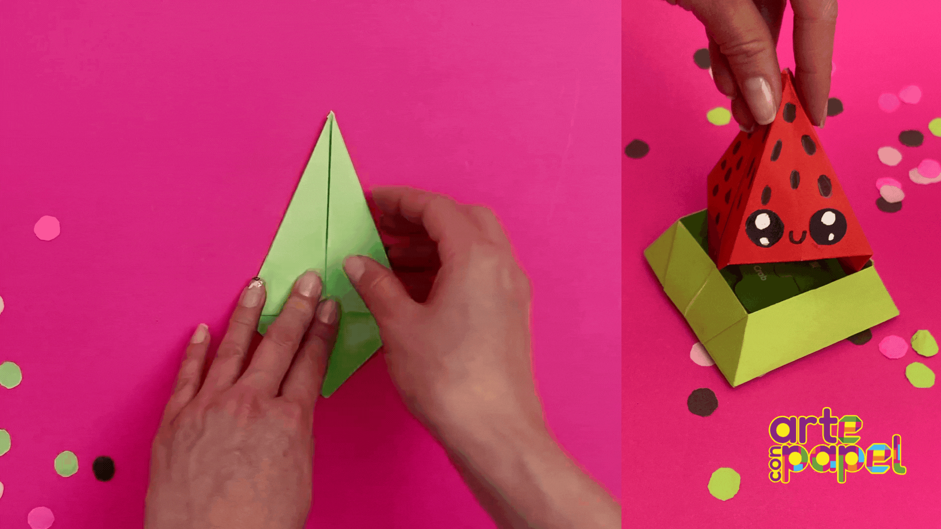 Abre la parte de abajo con cuidado y mete los triángulos restantes. Después, apoya la figura en la mesa y dóblala de abajo hacia arriba.