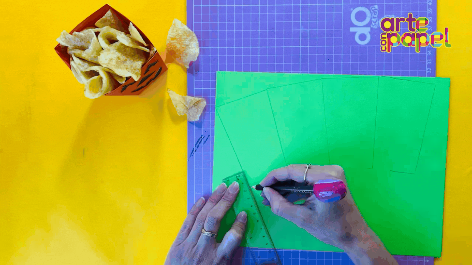 Con una plantilla de las siguientes medidas: 7 cm de ancho, 11 cm de alto y 5 cm de base. Marca 4 figuras seguidas.