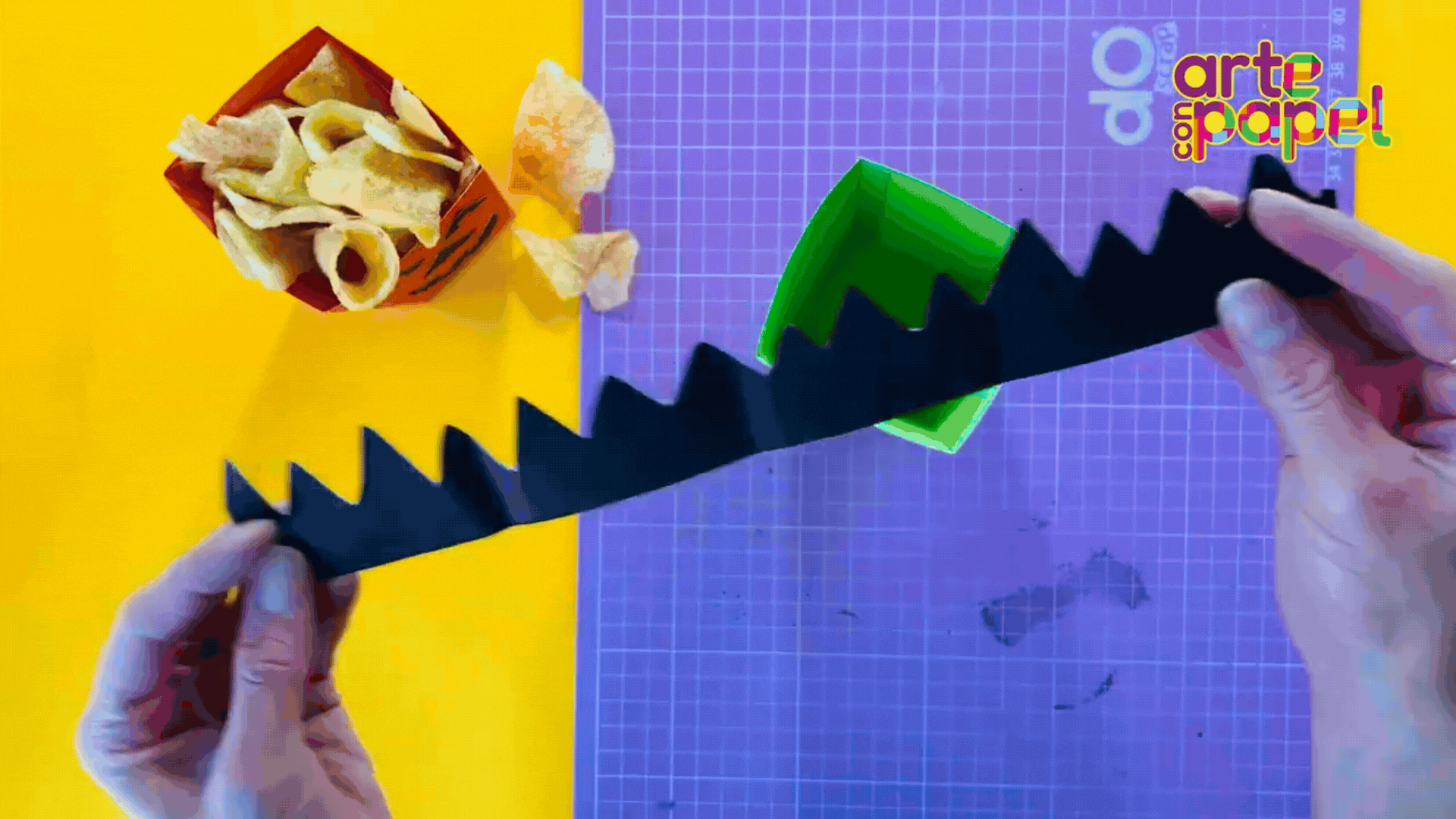 Recorta en zigzag una tira de cartulina negra de 28.5 cm de largo para formar el cabello. Pégala en el borde superior de la palomera.