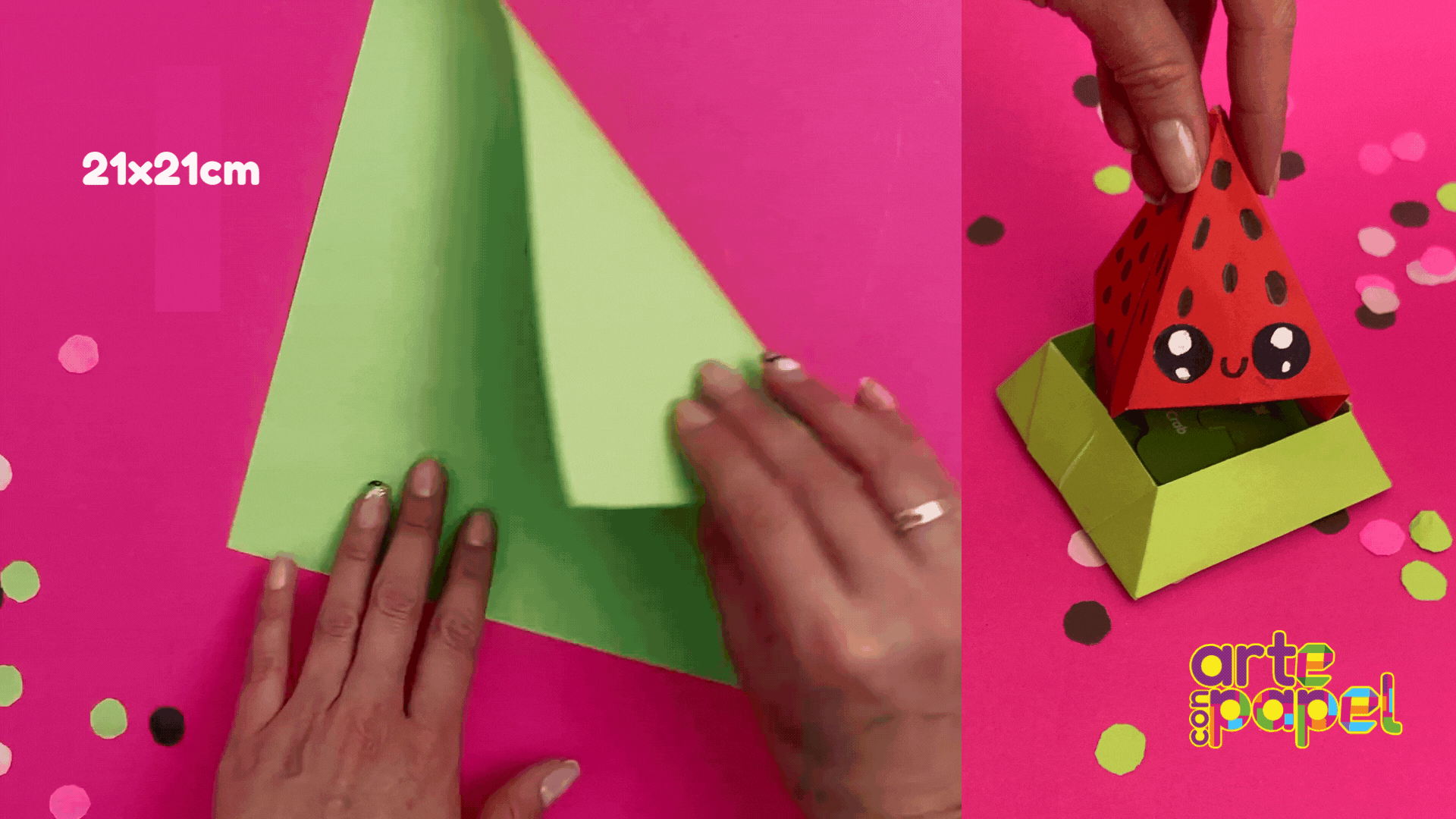 Corta un cuadrado de 21x21 cm. Dóblalo por la mitad en diagonal, despliega y repite con la otra diagonal.