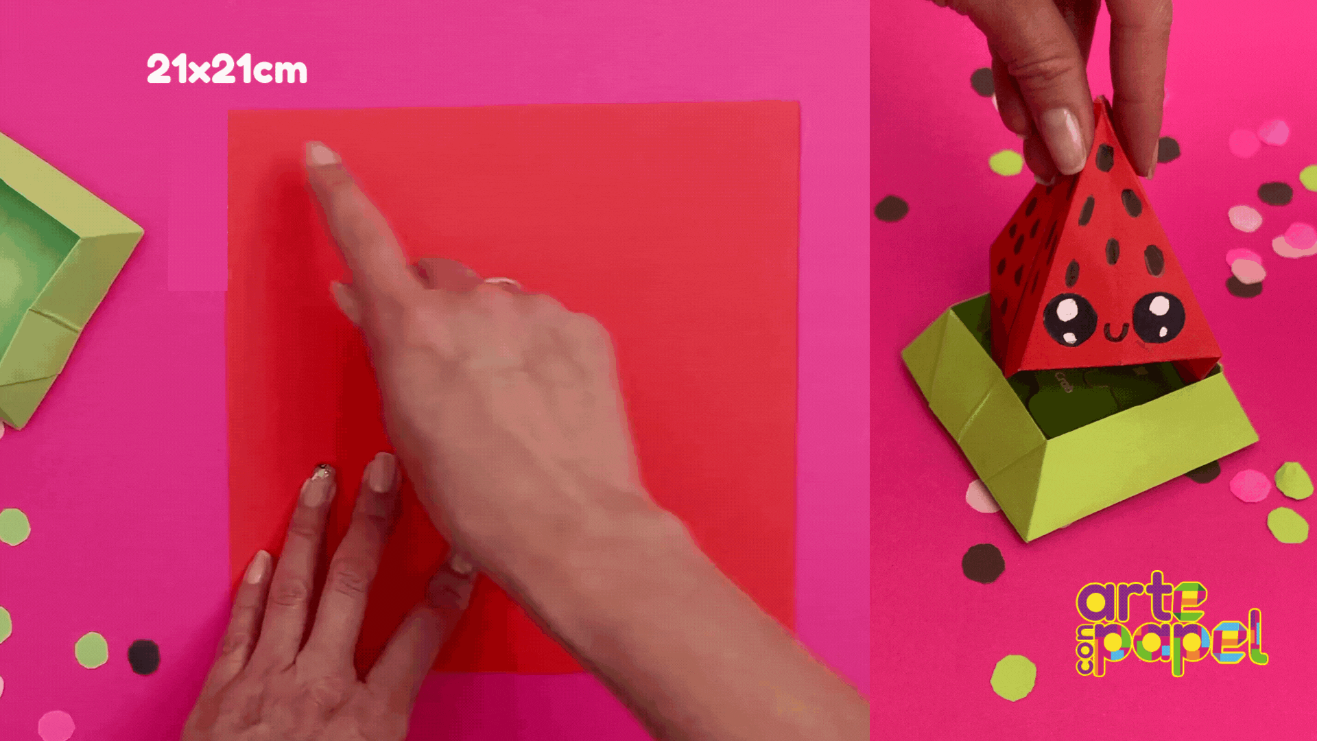 Jala ligeramente la parte inferior de la figura y ábrela hasta tener una base profunda. Corta otro cuadrado de 21x21 cm y repite el paso 1 y 2.