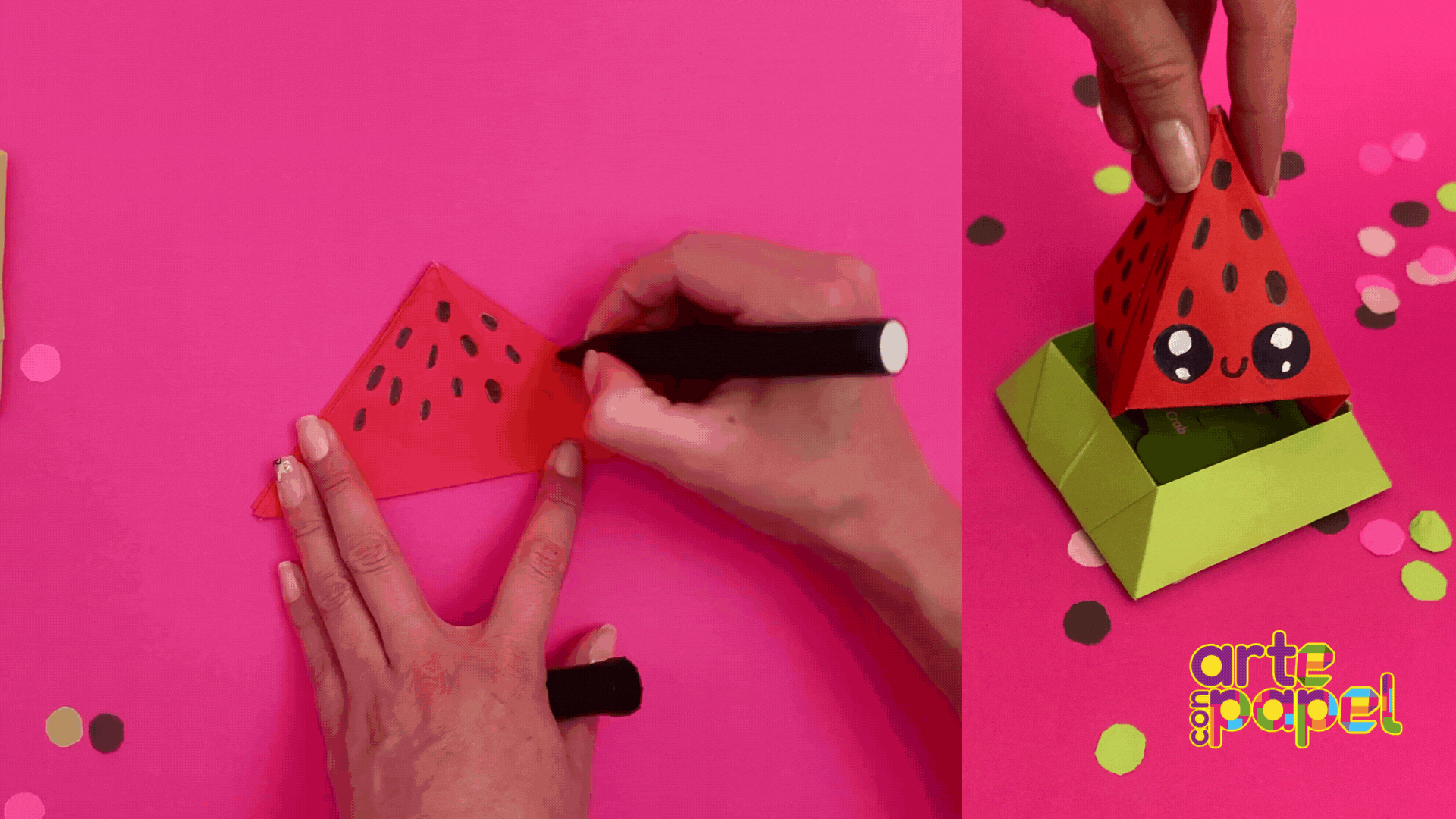 Decora la tapa con un plumón negro para hacer las semillas de sandía, además dibuja los ojos y la boca. ¡Listo!
