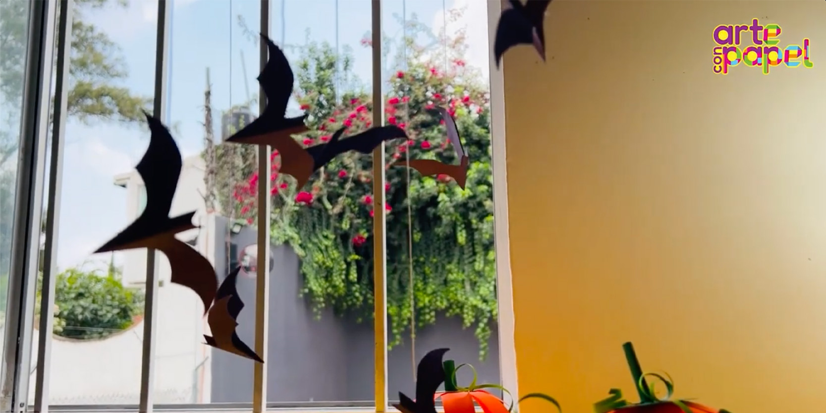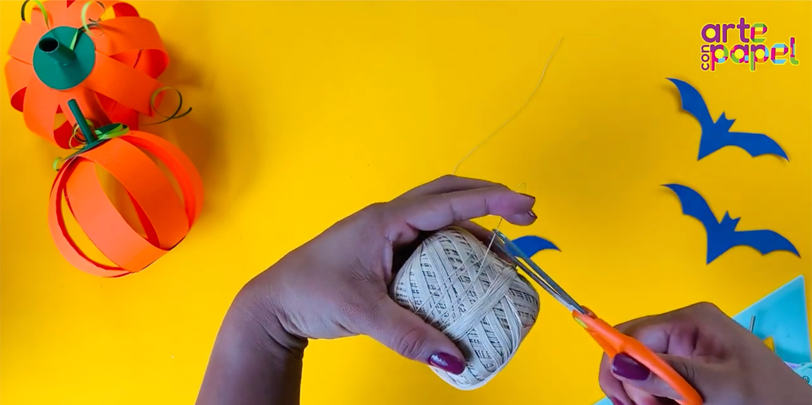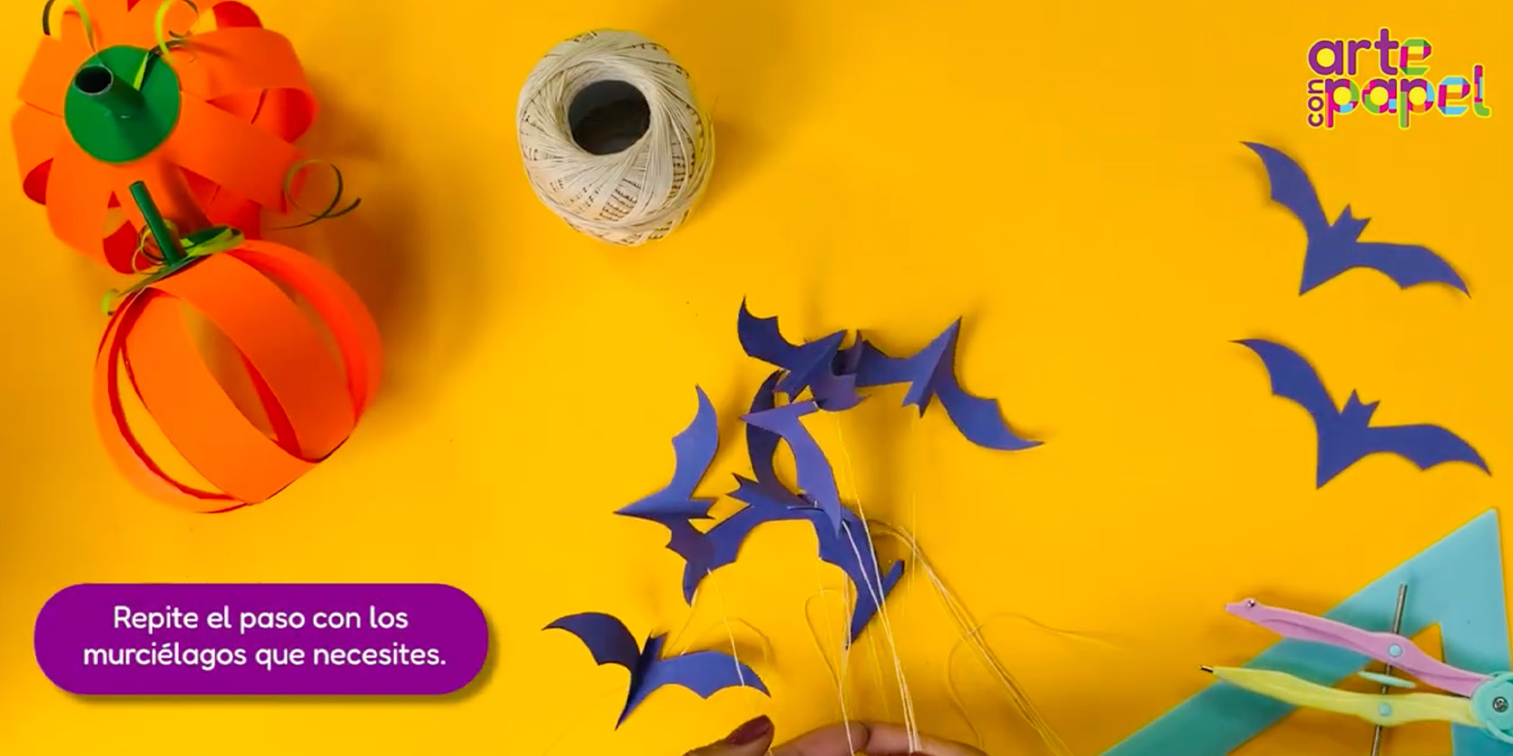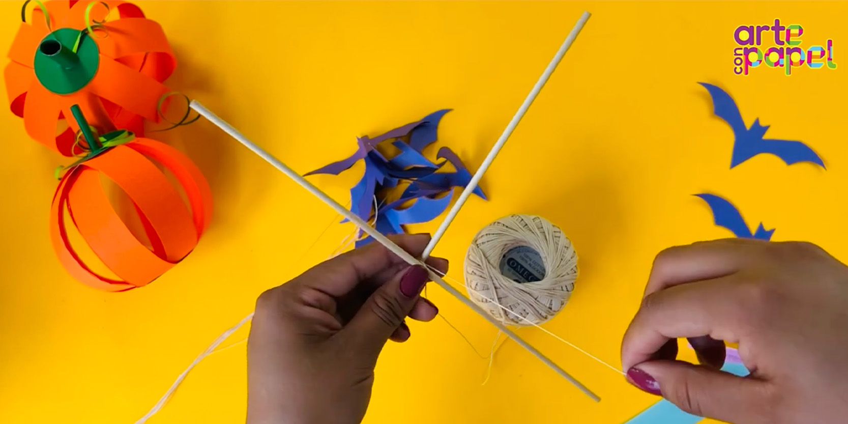 Amarra los murciélagos a los palitos de madera, procura nivelar el paso y ¡listo, ya tienes tu móvil colgante!