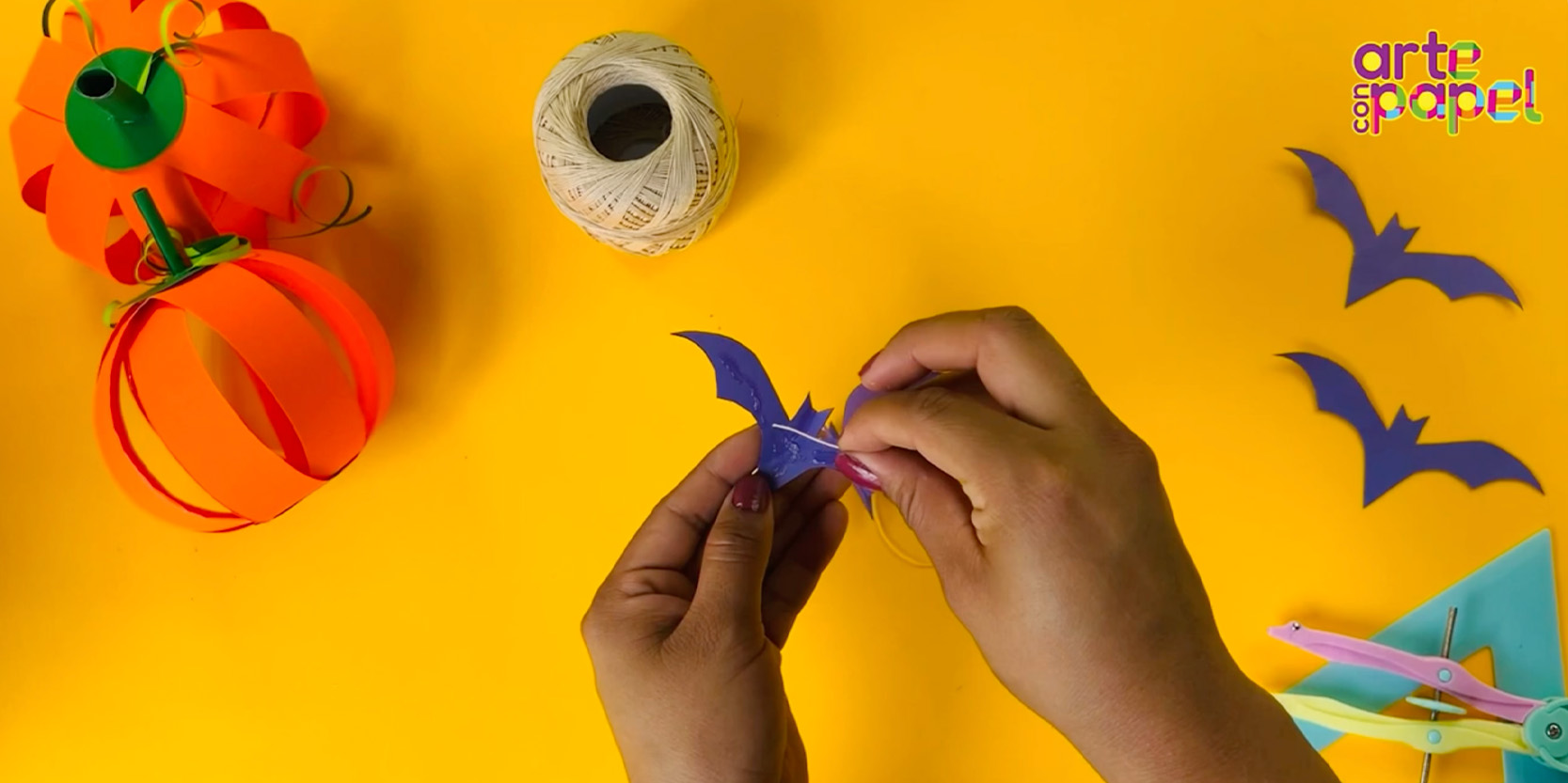Pon pegamento sobre uno de los murciélagos y pega el hilo sobre un ala.